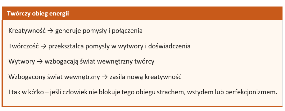 Rozwijanie kreatywności z kolei zasila twórczość. Twórca, który ćwiczy myślenie dywergencyjne, ma więcej dostępnych ścieżek do eksploracji. Twórca, który poznaje różnorodne dziedziny, ma więcej materiału do syntez i analogii. Twórca, który uczy się obserwować uważnie, ma bogatszy świat wewnętrzny do wyrażenia.